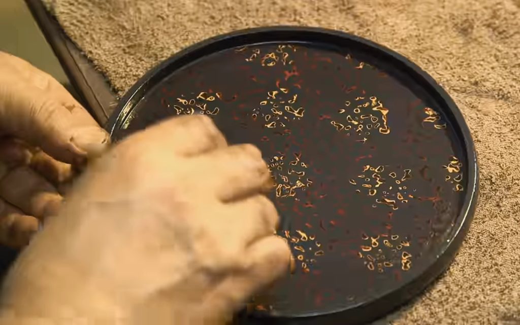 ツヤ付けも2回ほど摺り漆を行い、しっかりと磨き、ツヤをつけます。