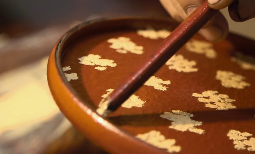 仕掛がしっかりと乾燥したのち、その模様を引き立たせるために一般的には石黄(黄色の彩漆)を塗ります。