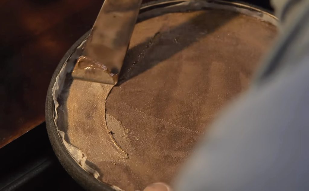 ここでは丸盆に布張りの工程を行います。