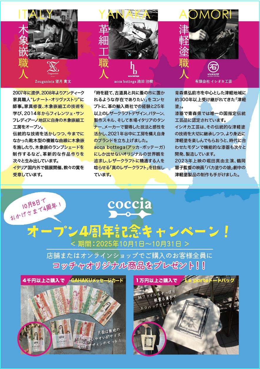 イタリアの木象嵌作品と東京谷中の革細工作品、そして青森から津軽塗作品が展示販売されます。