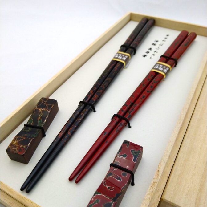 お箸・箸置き・箸箱【イシオカ工芸】 夫婦箸・箸置きセット 津軽塗 唐塗呂上・赤上(桐箱入) 通常価格11990 円 (税込) 購入はこちら ※30,000円以上のお買い上げで送料無料になります。説明御結婚のお祝いに人気の夫婦箸と箸置きセットです。丈夫で長持ちする津軽塗のお箸を贈り物としていかがでしょうか? 商品詳細 素 材:箸(天然木)箸置き(天然木)塗 装:漆塗装サイズ:箸大(235㎜)中(205㎜)箸置き(幅50㎜×奥行12㎜×高さ10㎜) 桐箱(幅270㎜×奥行130㎜×高さ23㎜)コメントは受け付けていません。